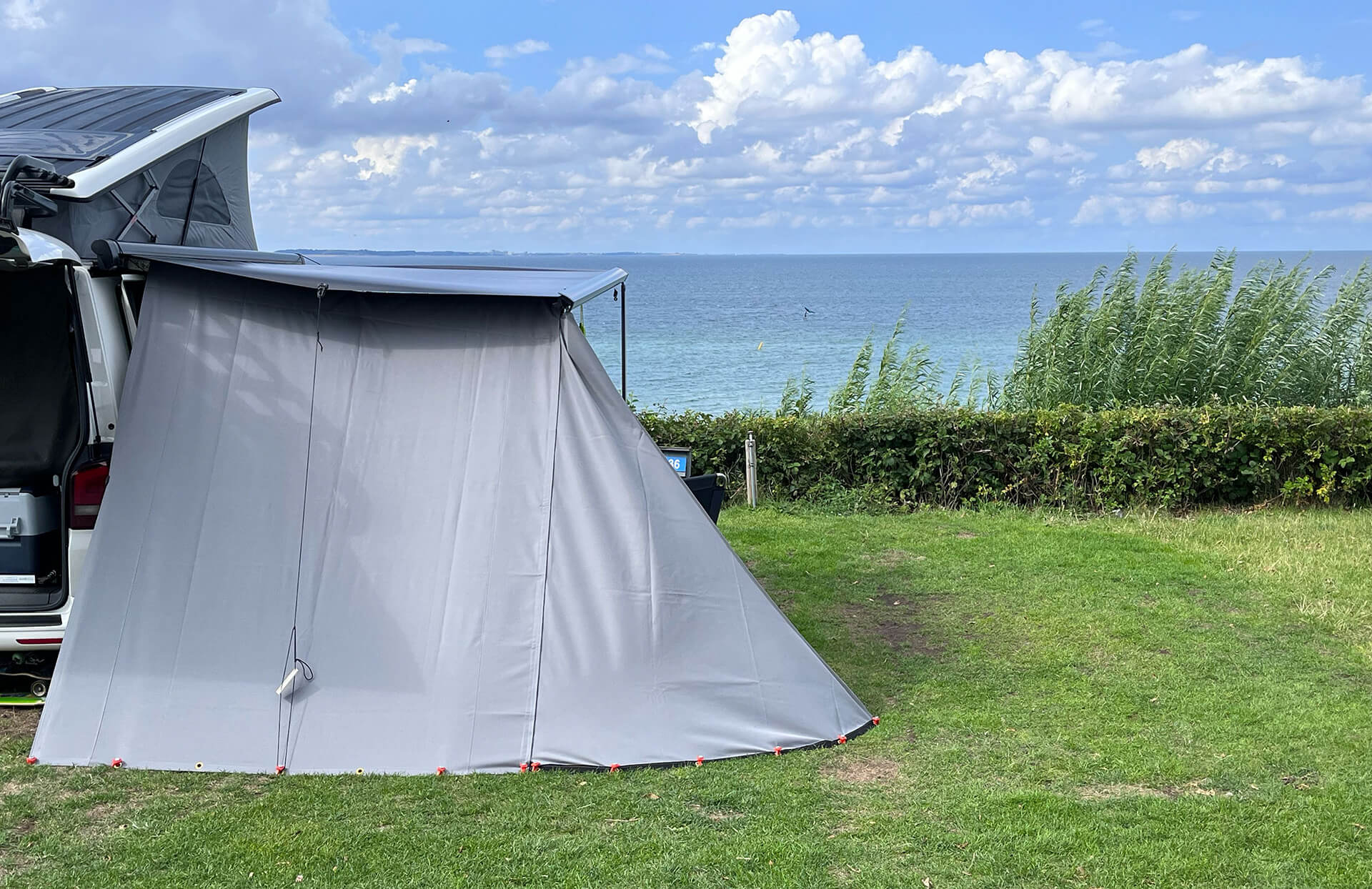 - Seitenteil wird über den Markisenarm gelegt und mittels Reißverschluss befestigt