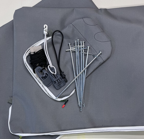 - mit stabilen Heringen und Klemmen um den Markisenstoff abzuspannen