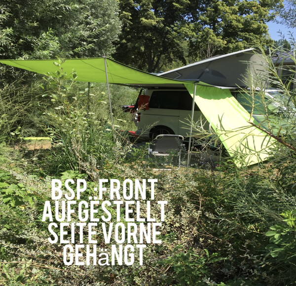 - Seitenteil wird über den Markisenarm gelegt und mittels Reißverschluss befestigt und kann hinten wie vorne gehängt werden